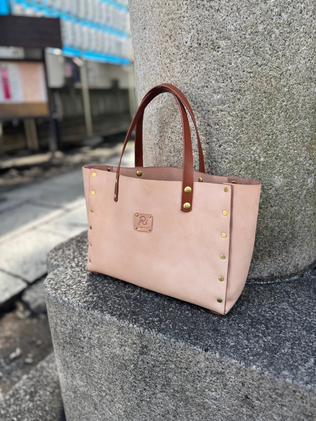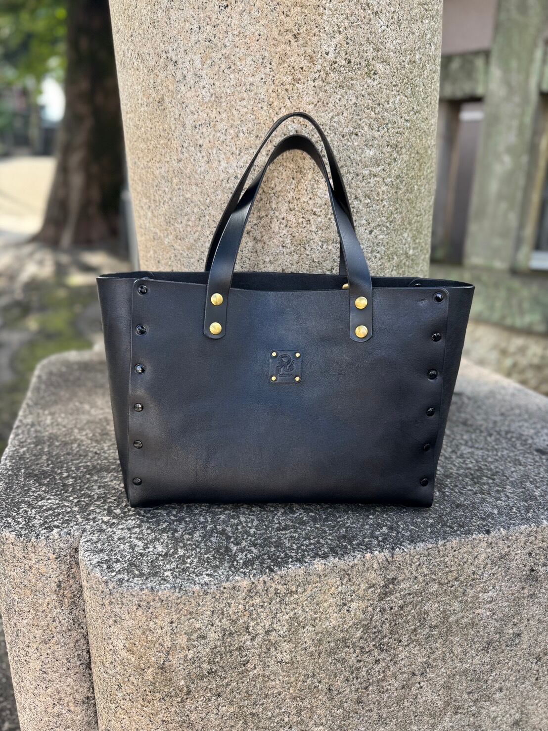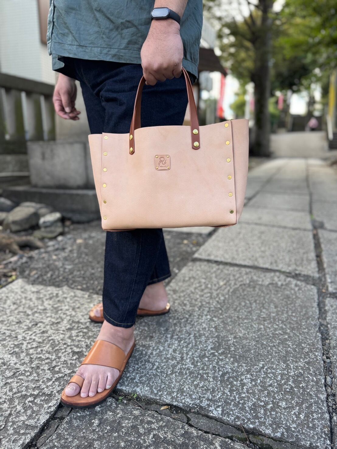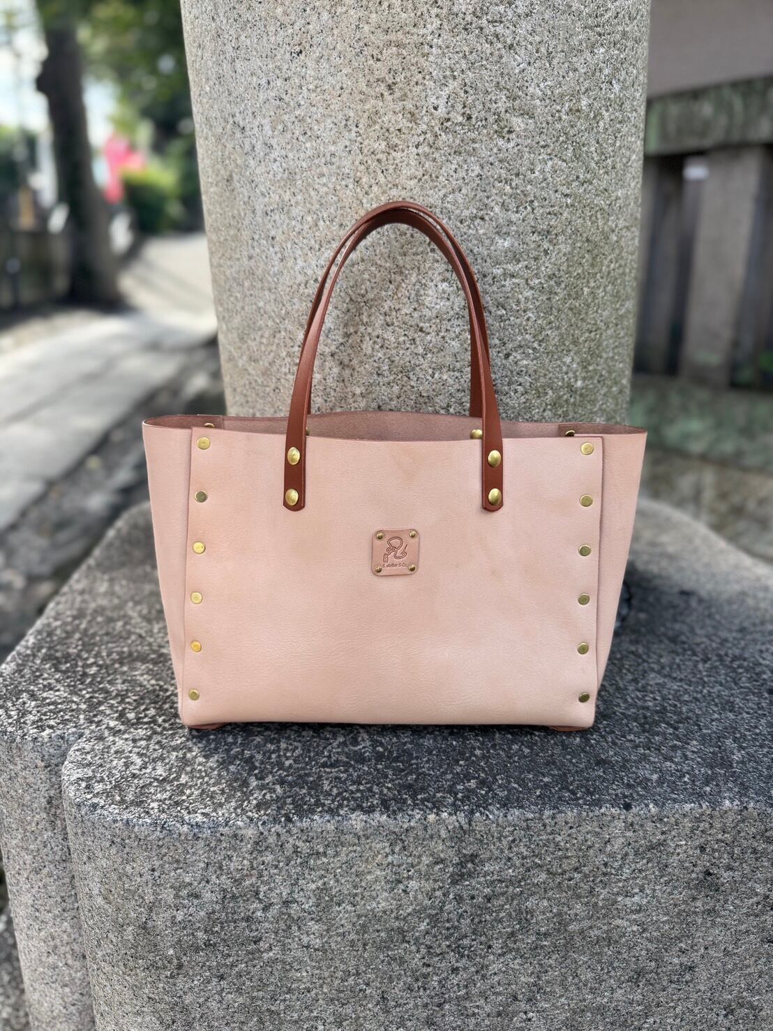控えめな美しさの中に確かな存在感を宿すこのトートバッグは、栃木レザーのナチュラルな質感と、真鍮リベットの温かい輝きが調和した一品です。